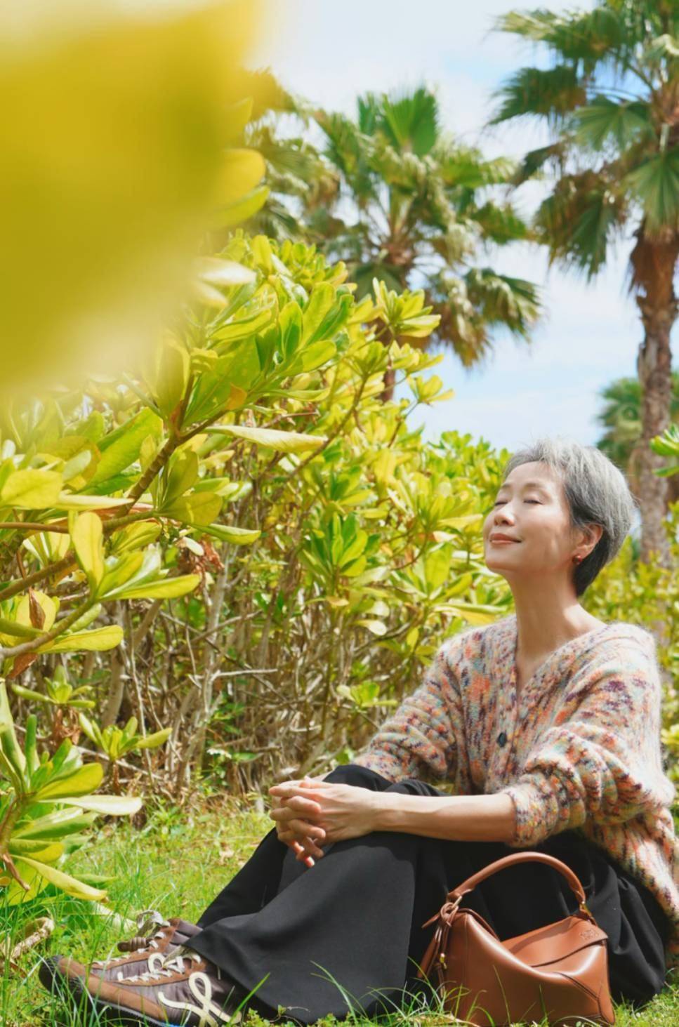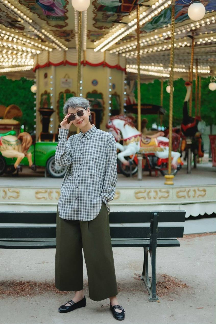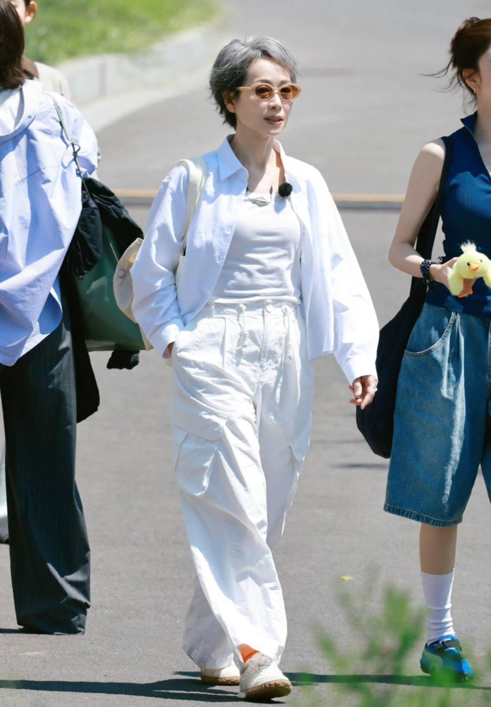 62岁的美,无需靠近年轻、嫩,而是要做到极简优雅,廓形短衬衫当成外套穿,搭配白色工装裤,活力感爆棚。