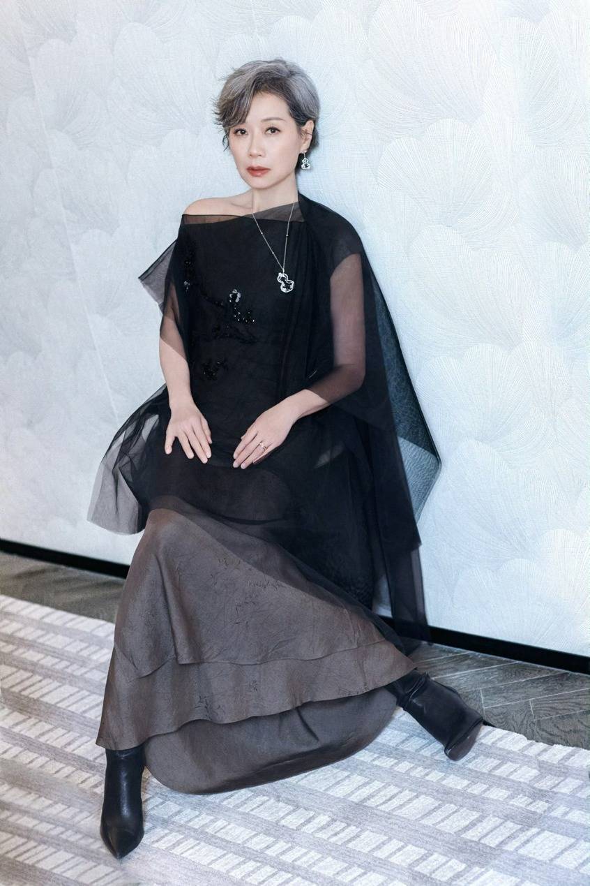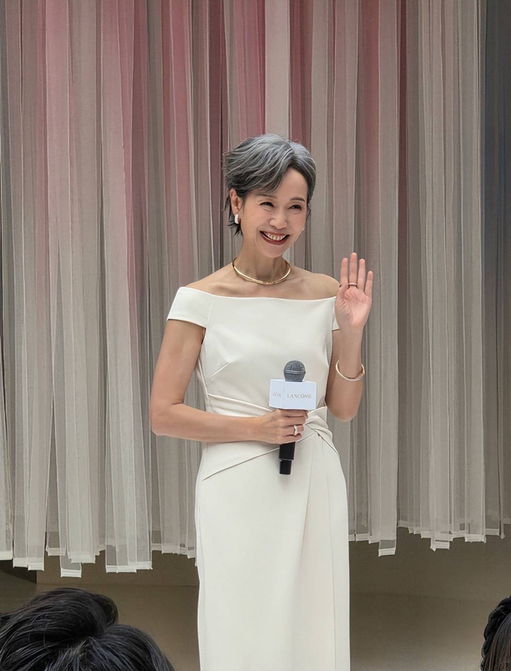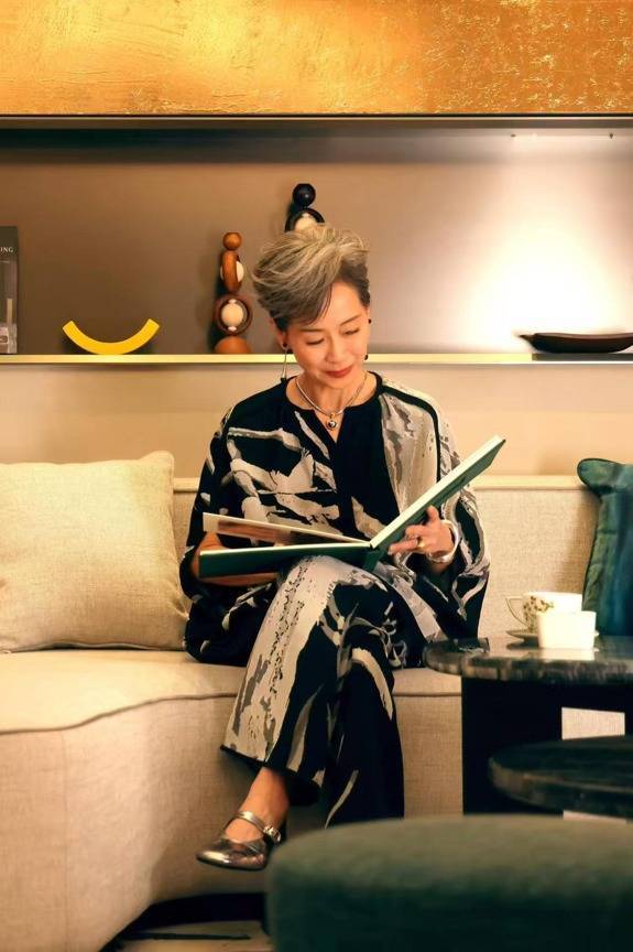 一头淡雅的灰白短发,和精致的淡妆相得益彰,穿一身黑白配,却照样可以美得独一无二,站在那里就是“主角”。