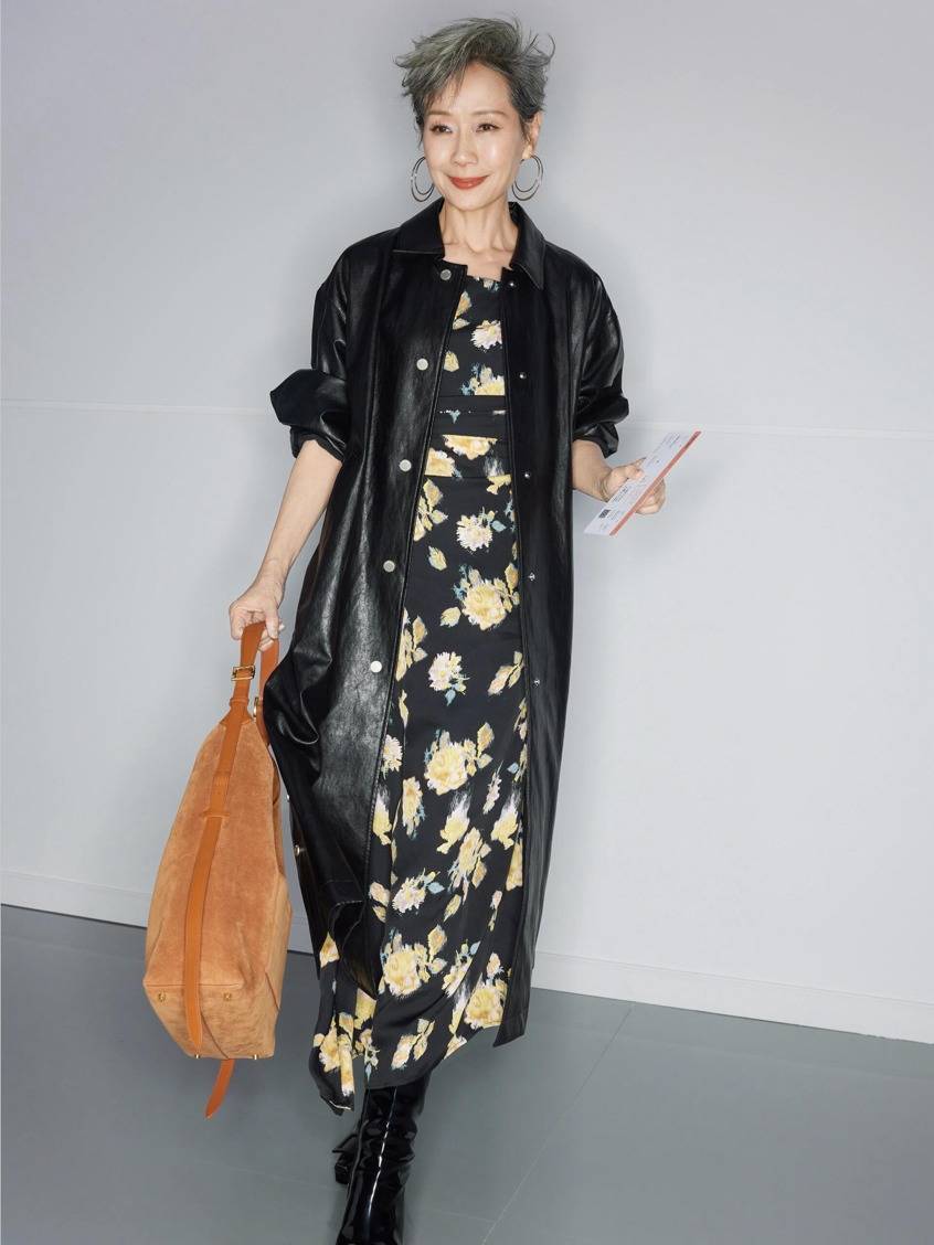 日常穿搭就要强调精致感,皮革材质的长外套,叠穿印花连衣裙,佩戴上双层圆形耳环,拎款手提包好有范儿。