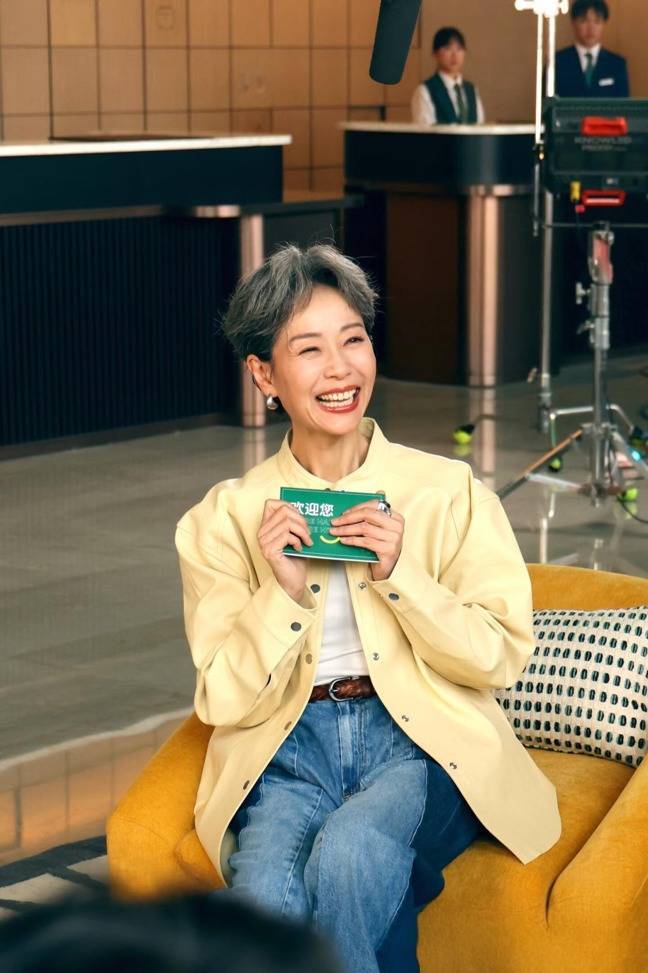 叶童不喜欢大面积的使用艳丽色彩,像这种柔和的淡黄色外套,搭配牛仔裤,就完全没有年龄限制。