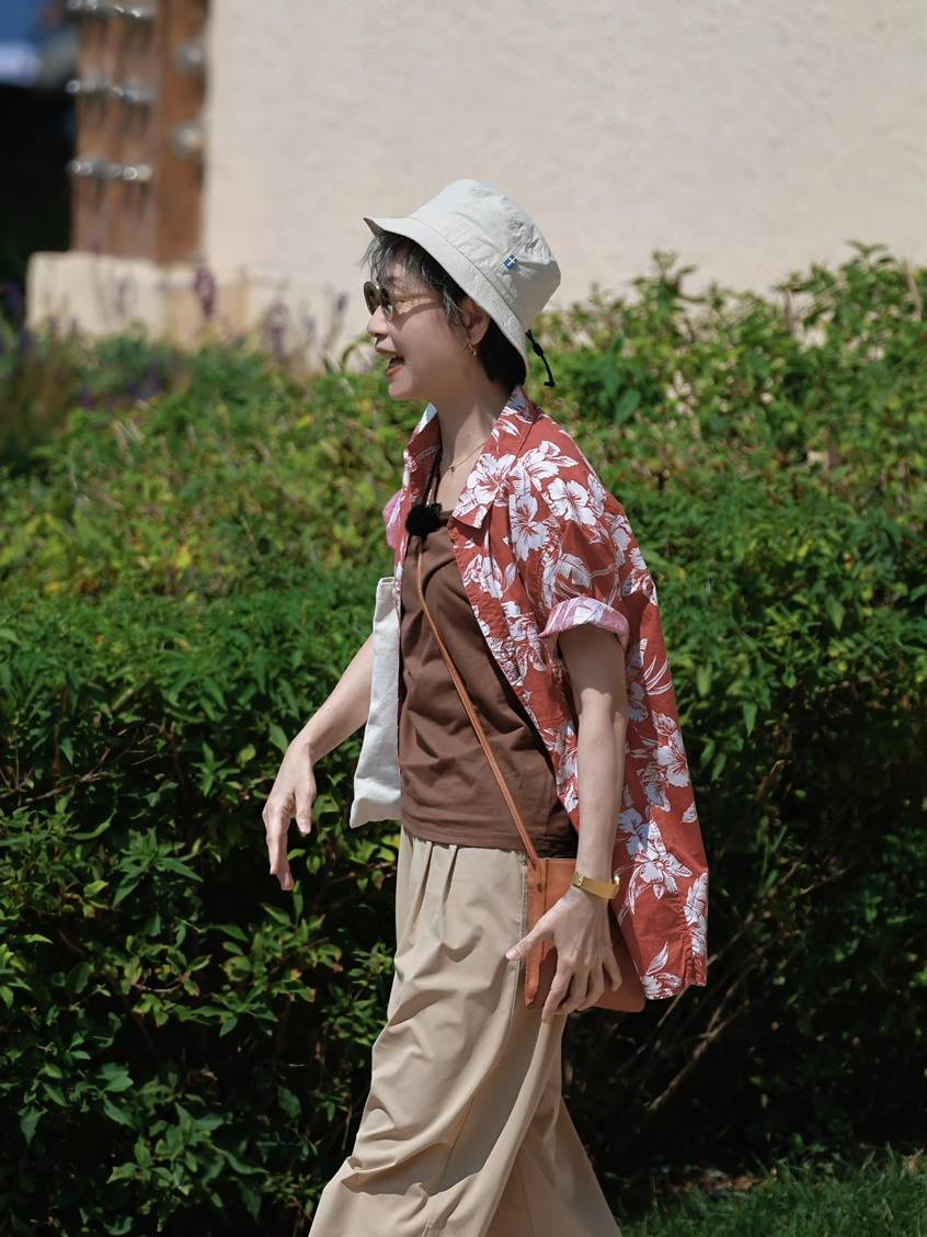 不需要张扬的珠宝配饰,也不用多么华丽的衣裳,休闲风的印花衬衫配阔腿裤,戴顶渔夫帽就很美~